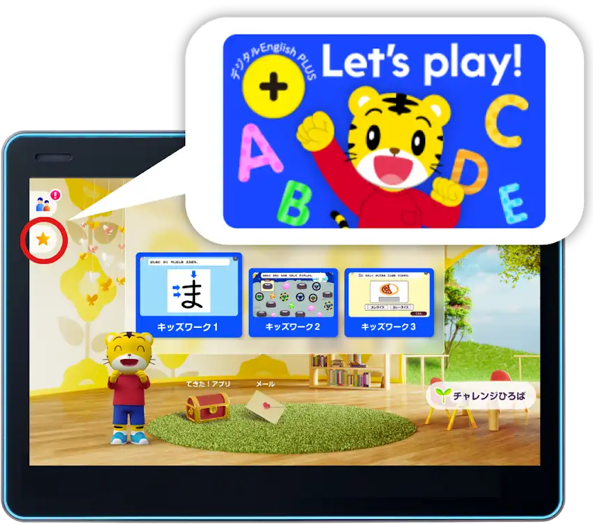 「まなびルーム」ホーム画面左上の☆(スペシャル)内のデジタルEnglishプラスバナーから取り組む。