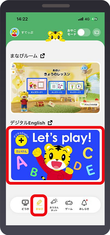 ②しまじろうアプリホーム画面下部「まなび」内のデジタルEnglishプラスバナーから取り組む。